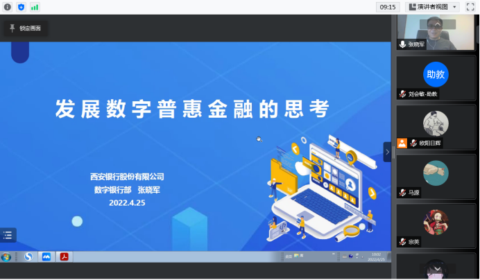 2022年4月25日上午10点,西安银行股份有限公司数字银行部总经理张晓军应邀加入新葡萄8883官网AMG官网“数字金融理论与实务”线上课堂,以“发展数字普惠金融的思考”为题,为同学们带来了一场精彩纷呈的讲座。