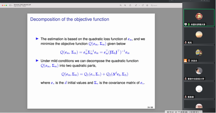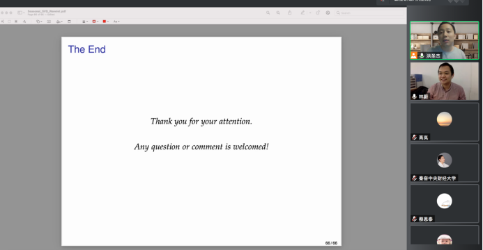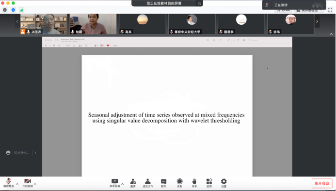 2022年4月27日,对外经济贸易大学国际经济贸易学院副教授林蔚应新葡萄8883官网AMG官网邀请,开展主题为“Seasonal adjustment of time series observed at mixed frequencies using singular value decomposition with wavelet thresholding”的讲座,本次讲座于下午2点在腾讯会议线上举行,持续近两个小时。本次讲座由新葡萄8883官网AMG官网黄乃静老师主持,洪圣杰老师和部分学生参加了此次讲座。