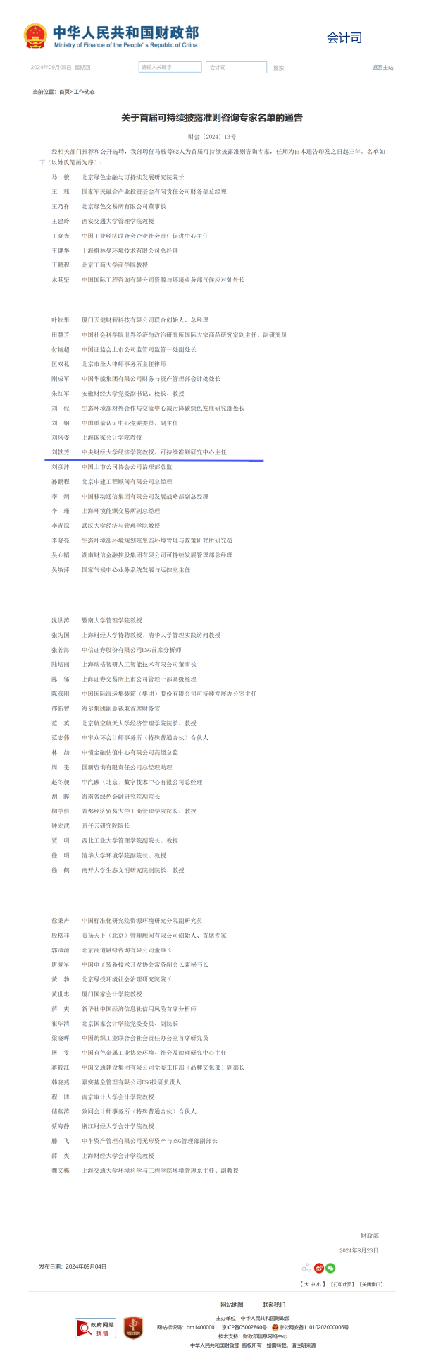 2024年9月4日,财政部公布了首届可持续披露准则咨询专家名单,经相关部门推荐和公开选聘,首届共聘任62名专家学者,任期为三年。新葡萄官网可持续准则研究中心主任刘轶芳教授,受聘为财政部首届可持续披露准则咨询专家。