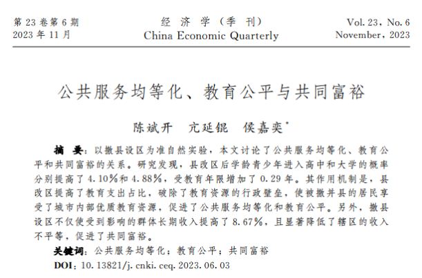 学术视点 | 新葡萄官网陈斌开老师的合作论文《公共服务均等化、 教育公平与共同富裕》在《经济学(季刊)》刊发