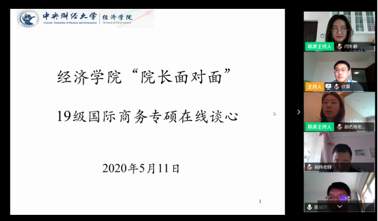 为深入了解国际商务专硕学生的想法和期待,进一步提升学院国际商务专硕的培养质量,院长陈斌开、副院长伏霖、副书记耿卉、组织员刘滨、国际经济系主任于爱芝、顾炜宇、祝伟、赵若思等8位专任教师和教辅老师于2020年5月11日下午,以在线会议的方式举行此次的“院长面对面”活动。陈斌开院长以及各位老师与新葡萄8883官网AMG官网19级国际商务专硕班的全体学生,围绕专硕同学就学习和生活方面的切身问题,进行深入的交流沟通。