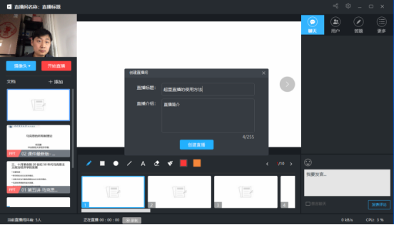 在用超星直播之前,我尝试使用过腾讯会议、超星学习通的直播和同步课堂。比较之后发现超星直播有如下优点:(1)可回看。有同学反映在上直播课的时候,有时候会因为突然的网络问题听不到老师的声音。超星直播支持回放,同学们可在课程直播结束后回看。即使在直播时有些内容没听懂,也可以通过回看的方式重新学习一遍。(2)直播形式多样,可以只显示老师的头像,也可以同时显示头像+ppt,还可以把屏幕分享给同学。(3)可以通过文字聊天的方式与同学实时互动。