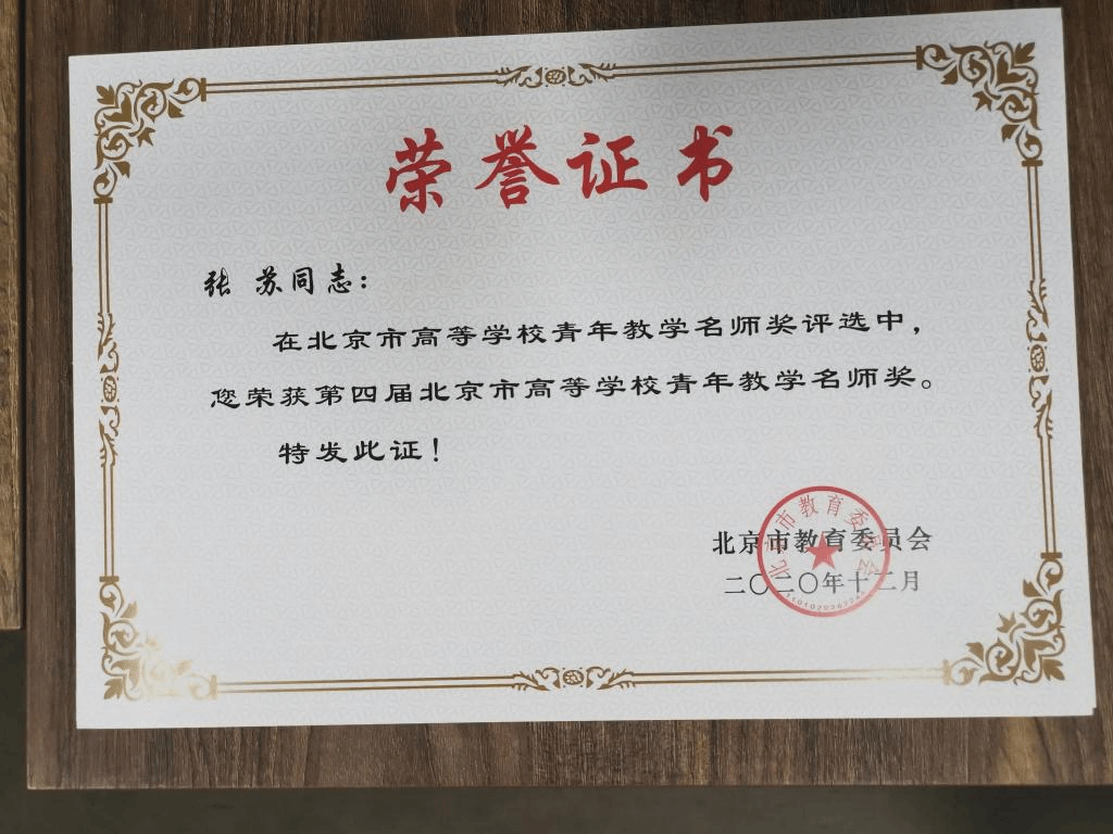 近日,北京市教育委员会公布了“第十六届北京市高等学校教学名师奖和第四届北京市高等学校青年教学名师奖”获奖名单,新葡萄官网张苏教授获得第四届北京市高等学校青年教学名师奖。