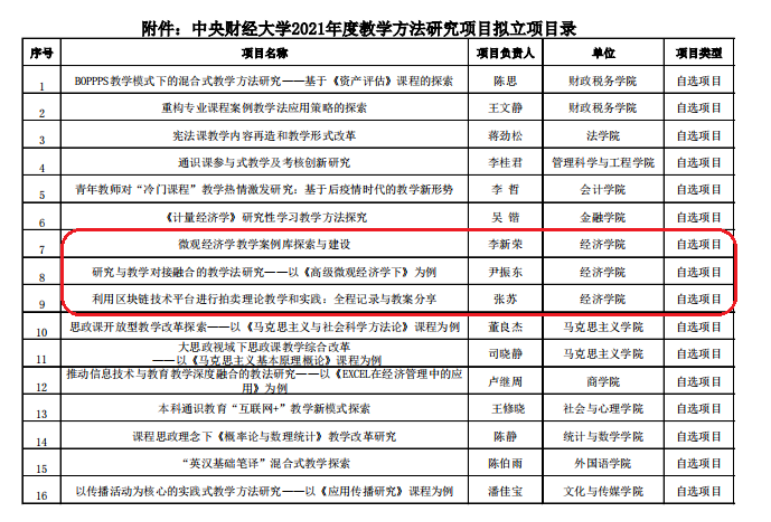 根据《关于申报2021年度教学方法研究项目的通知》要求,学校进行了2021年度教学方法研究项目立项评审工作,经专家评审,决定对2021年度申报的课题进行立项,其中新葡萄官网李新荣、尹振东、张苏三位教师的课题获得立项。