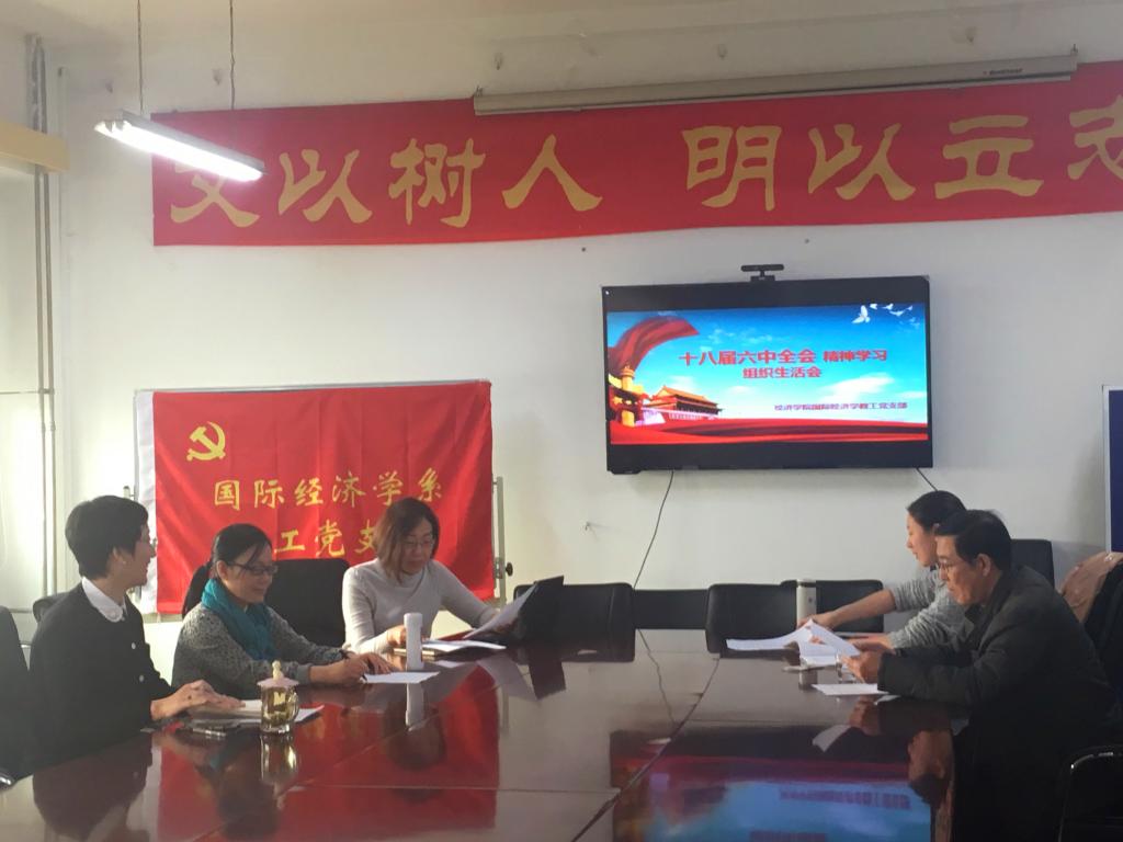 12月21日中午,新葡萄8883官网AMG官网国际经济学教工党支部4名党员在学院南路校区1305会议室组织十八届六中全会、全国高校思想政治工作会议精神专题学习,学习研讨了习近平总书记《把思想政治工作贯穿教育教学全过程》的重要讲话。专题学习由党支部副书记赵若思同志主持,新葡萄8883官网AMG官网党委书记雷洪峰列席会议。
