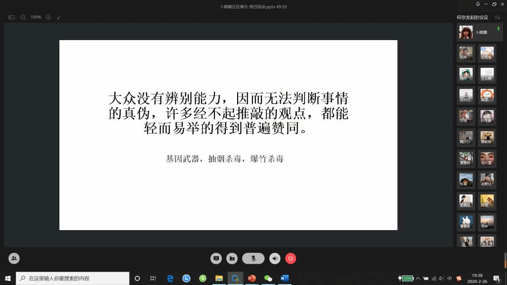 最后,全体党员结合疫情防控中涌现出的典型事件、社会热点、先进事迹分享交流自己的所见、所感。宋程瑜号召大家关注疫情统计数字背后的鲜活生命,记住所有创造奇迹的平凡个体,敬畏自然和生命;卜晓蕾认为,疫情是对新媒体时代下民众的信息筛选和甄别能力的巨大考验,信息传播能让世界听到更多普通人的声音,但真假混杂,也容易被谣言裹挟,我们身处其中要明辨是非、保持理性,不做乌合之众;陶然分享自己外地返乡时被隔离期间接收到的社会温暖;何则懿讲述了她积极帮助当地医院在微博、微信公众平台筹集物资的故事;孙瑶、左熙钰认为,这次疫情更凸显了社会主义制度的优越性以及共产党员的担当与作为。