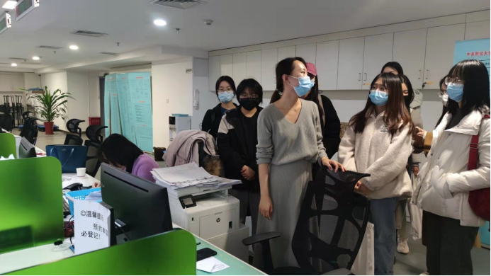 最后,同学们跟随财务处的老师来到师生服务大厅财务处服务窗口,观摩财务处的办公流程。来自会计核算科的于潇溆老师在工作台耐心演示财务处日常工作流程,介绍了我校财务处的信息化办公。同学们向老师学习了学校财务系统的运作流程、发票报销的具体规范,对学校行政部门的办公环境和日常工作有了直观感受,也对事业单位会计工作有了初步了解。