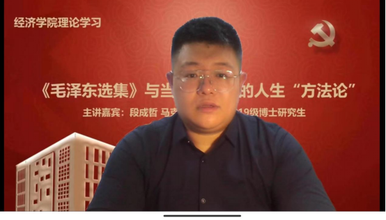 其次,段博士还从方法论的视角分析了毛泽东思想对于当今社会和大学生发展的现实启示。他指出,《实践论》和《矛盾论》的方法论让我们更理性地看待疫情防控中出现的问题,更积极地面对疫情给我们生活带来的影响;唯物史观及其方法论让我们以人民的立场看待历史事件,利用阶级分析法洞悉社会问题的本质;《毛泽东选集》中对青年的论述不断教育着我们打开人生格局,并以共产主义信仰为追求,投入到中华民族伟大复兴的进程中。
