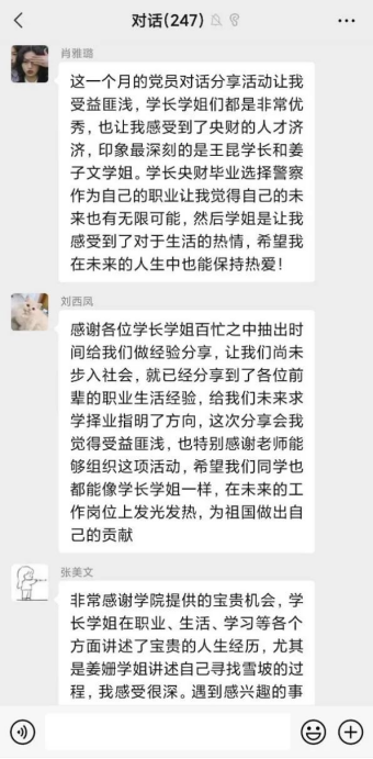 新葡萄8883官网AMG官网党委特邀请了李响、朱炬兵、孙建华、姜姗、张川石、姜子文、张银、王昆、王朝阳、田燕刚等十位工作在各行各业的基层党员校友和嘉宾。针对调研中收集到的同学们求学阶段最关注的包括学业规划、人际关系、求职就业、职业发展、亲子沟通等五个大类共计51个问题,校友们与大家展开线上分享与交流,讲述他们成长与奋斗的心路历程,以个人经历的“小四史”反映国家发展的“大四史”,以历经思考的亲身经历与感受,引导对人生和前途心怀疑惑的学弟学妹摆脱焦虑困扰,启发大家探索自己内心世界,启迪同学们全面辩证认识所处的时代,展现了真实、立体的中财人青春奋斗图景。新葡萄8883官网AMG官网党委书记郭冬梅老师鼓励大家学史明理、学史增信、学史崇德、学史力行,与时代同步伐、与人民共命运,切实做到不忘初心、脚踏实地、忠诚奋进!