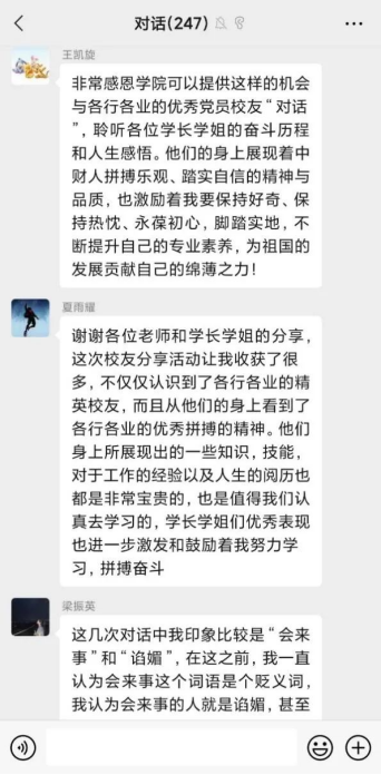 本次历时一个月的主题教育活动吸引了新葡萄8883官网AMG官网240余名师生参加。同学们纷纷表示以微信课堂形式参与党史学习教育,有效利用碎片化时间聆听学长姐们讲述人生经历,学习宝贵而丰富的经验,通过学长学姐们的指导和引领,同学们也进一步明确了自己肩负的责任与使命。