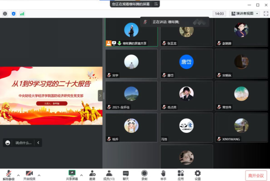 11月1日,新葡萄8883官网AMG官网国防经济研究生党支部在南路校区图配楼205以线上和线下相结合的方式,召开党的二十大精神专题学习研讨会。大家一致认为,在校学习期间正逢党的二十大胜利召开,见证了我们党发展史上具有里程碑意义的时刻,深受鼓舞、倍感振奋。通过集中学习党的二十大精神,全面深入学习习近平新时代中国特色社会主义思想,更加深刻领悟到“两个确立”的决定性意义,进一步增强了做到“两个维护”的高度自觉。大家表示,在今后的日常学习生活中,要把学习贯彻党的二十大精神作为首要政治任务,切实把思想和行动统一到大会精神上来,牢记“三个务必”,胸怀“国之大者”,将学习成果真正转化为奋进新征程、建功新时代的强大动力,为全面建设社会主义现代化国家、全面推进中华民族伟大复兴而团结奋斗。