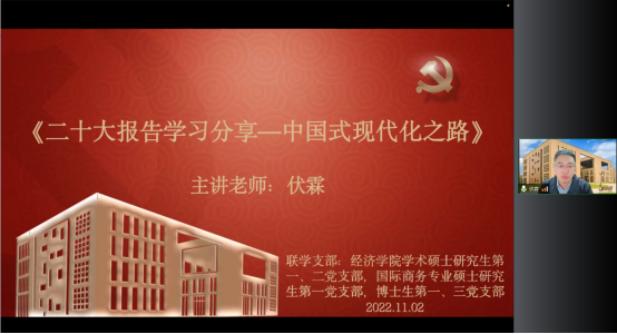 11月2日,新葡萄8883官网AMG官网党委委员、副院长伏霖“牵手”新葡萄8883官网AMG官网学术硕士研究生第一、二党支部,国际商务专业硕士研究生第一党支部,博士生第一、三党支部,作主题为“二十大报告学习分享——中国式现代化之路”的专题分享。基于经济思想史的理论视角,从什么是现代化、什么是中国式现代化和怎样实现中国式现代化三个维度进行深度阐释,呼吁学生要奋力走在率先实现社会主义现代化最前列。