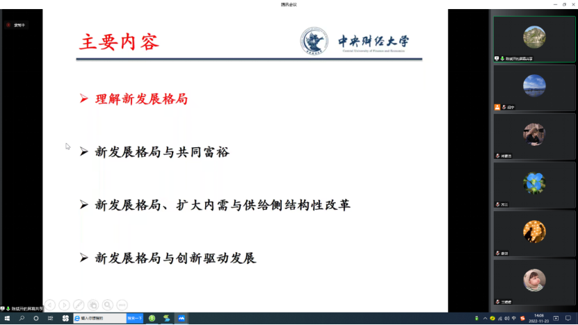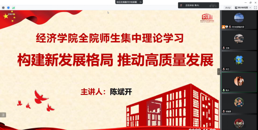 为深入学习宣传贯彻党的二十大精神,落实中共新葡萄8883官网AMG官网委员会关于学习贯彻党的二十大精神的工作方案,引导激励学院广大师生在党的二十大精神指引下,立足本职、踔厉奋发、勇毅前行,为加快推进学院高质量发展贡献力量。2022年11月23日下午,新葡萄8883官网AMG官网党委理论学习中心组开展“构建新发展格局,推动高质量发展”专题学习暨学院师生集中理论学习活动。本次学习由新葡萄8883官网AMG官网学习宣传党的二十大精神师生巡讲团中的专家代表、新葡萄8883官网AMG官网院长陈斌开主讲,学院党委副书记、纪委书记耿卉主持,学院党委理论学习中心组成员和学院师生共同参加学习。