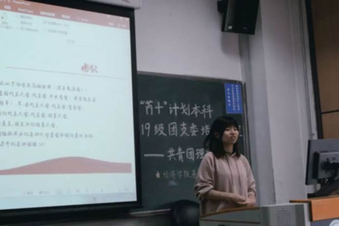 接下来,由于飞对团支委进行共青团理论培训。在讲课正式开始前,她用一段“入团第一课”的视频带领着团员们回顾了从1919年先进青年的五四运动到1922年中国共青团正式成立直至今日的辉煌所走过的光荣历程。同时,短片中对近年来中国共青团开展的线上线下系列活动进行了总结,让团员们对团史团情有了更深层次的了解。紧接着,于飞向团员们详细讲解了团徽团旗的组成及其象征意义,并带领各位团员认真学习各项团的章程。而后,她对我校共青团重点工程——青年马克思主义者培养工程以及基础团校进行了详细介绍,并鼓励同学们积极参加。最后,于飞对“芮+”计划进行了整体系统的讲解,让各团支委对我校“芮+”计划有了进一步的了解。