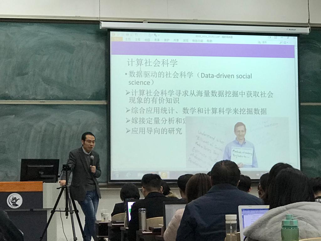2018年11月9号下午6:30,新葡萄8883官网AMG官网计算社会科学系列课程正式开始。课程第一讲由清华大学社会科学学院政治学系副教授孟天广老师于主教213主讲。此次课程主题为社科研究中的大数据方法,期间孟天广教授从大数据+社会科学、计算社会科学方法论、研究方法、研究议题以及大数据方法的支持和批评等五个板块出发,为我们系统介绍了当前计算社会科学的发展趋势和前沿研究。