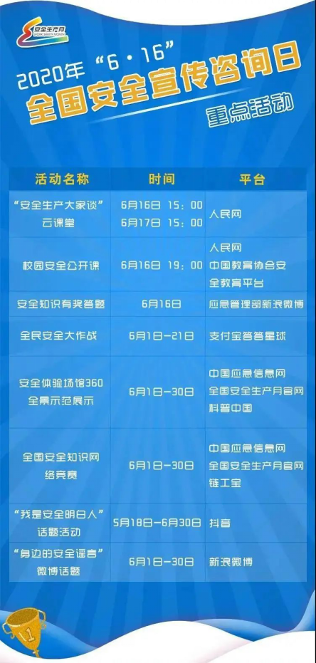 6月16日是全国安全宣传咨询日,按照国务院安委会办公室、应急管理部统一要求,在应急管理部新闻宣传司指导下,在人民网、支付宝、抖音、新浪微博、科普中国网等新媒体平台,开展“安全生产大家谈”云课堂、校园安全公开课、安全知识有奖答题、安全体验场馆360全景示范展示等系列活动,学习安全知识的同时,还可获得各种奖品,福利多多、好处多多,详情请关注中国应急信息网和全国安全生产月官网。具体活动预告如下: