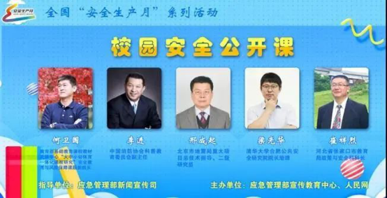 6月16日19:00登录人民网,与北京地震局重大项目总技术指导邢成起、北京消防救援总队原副总队长李进、清华合肥公共安全研究院院长助理梁光华、张家口教育局科长崔祥烈、教育部某课题组长何卫国等5位专家,交流学习防震减灾、消防安全、校园安全、阳光校园等方面内容,线上答疑释惑,帮助提高学生应急避险和自救互救能力。