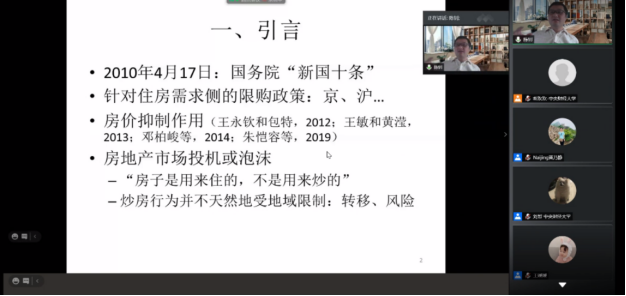 在交流环节,陈教授对大家的问题进行了耐心地解答,陈斌开老师、赵莉老师等参与讲座的老师和同学也积极提出了问题,并与陈教授进行了限购相关问题的探讨。线上讲座气氛活跃,参与的师生都表示受益匪浅。