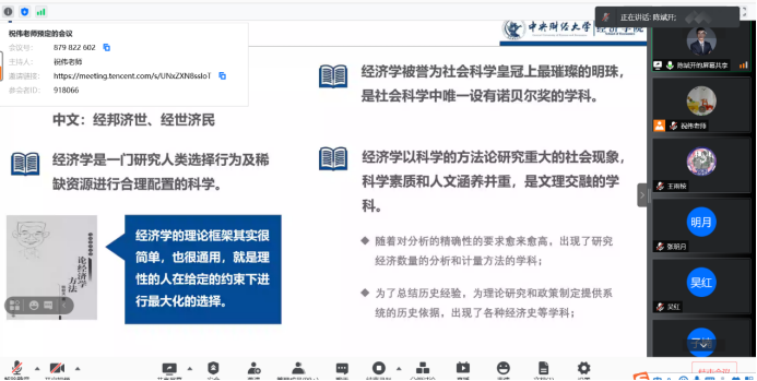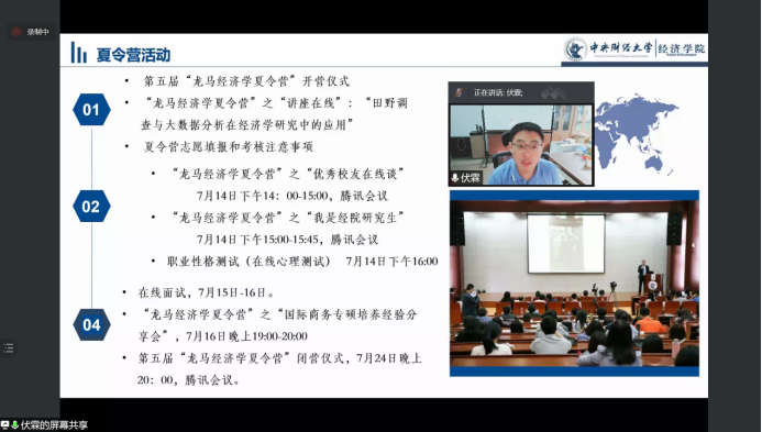 7月14日上午,第五届“龙马经济学夏令营”开营仪式通过腾讯会议举行。新葡萄8883官网AMG官网院长陈斌开教授、副院长伏霖副教授、导师代表戴若尘老师、学院教学科研管理办公室主任祝伟老师、研究生工作办公室主任赵若思老师和所有营员参加了此项活动。