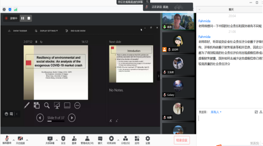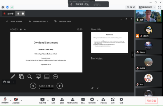 2021年9月16日和21日,英国埃克塞特(Exeter)大学可持续金融中心主任张晨迪教授应新葡萄8883官网AMG官网邀请,使用腾讯会议APP讲授行为金融专题研究短期课程。20多位师生参加了此次课程。