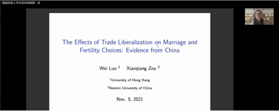 2021年11月5日下午,新葡萄8883官网AMG官网微观发展工作坊系列讲座第一讲在线上顺利举行。本次讲座的主题是贸易自由化对婚姻和生育选择的影响,由香港大学经管学院博士后研究员罗唯老师主讲,我校新葡萄8883官网AMG官网的赵文哲老师、胡志安老师、梁银鹤老师、徐竹烽老师以及中国人民大学劳动人事学院的邹先强老师参与了讲座。