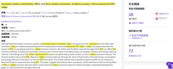 近日,新葡萄官网俞剑副教授与郭冬梅教授、财政税务学院杨龙见副教授、悉尼科技大学施训鹏研究员合作发表在国际能源经济学领域知名期刊《Energy Economics》(2021年第2期)的文章Economic policy uncertainty (EPU) and firm carbon emissions: Evidence using a China provincial EPU index于2021年11月成功入选ESI前0.1%热点论文和前1%高被引论文,这是我校2021年唯一入选ESI前0.1%热点论文。该文使用高频词人工筛选和人工阅读相结合的方式筛选出经济政策、不确定性的基础词条,首次构建了中国省级层面的经济政策不确定性指数,并考察经济政策不确定性对中国企业碳排放行为的影响。