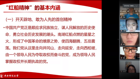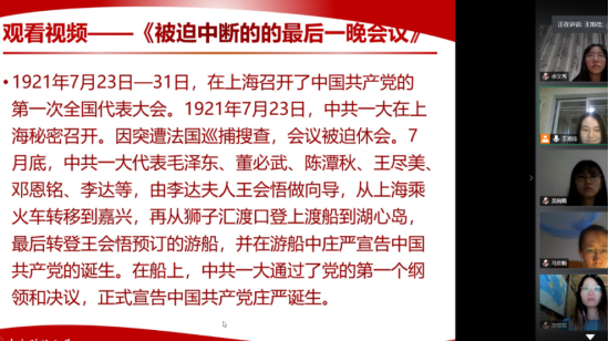 首先,由宣传委员王旭佳讲解“弘扬‘红船精神’、践行初心使命”主题党课,并观看视频《被迫中断的最后一晚会议》。“红船精神”代表了开天辟地、敢为人先的首创精神;代表了坚定理想、百折不挠的奋斗精神;代表了立党为公、忠诚为民的奉献精神。今天我们重温“红船精神”,便是要坚定党的领导,坚持为人民谋幸福、为民族谋复兴、为世界谋大同的初心。我们党的全部历史都是从中共一大开启的,我们走得再远都不能忘记来时的路。