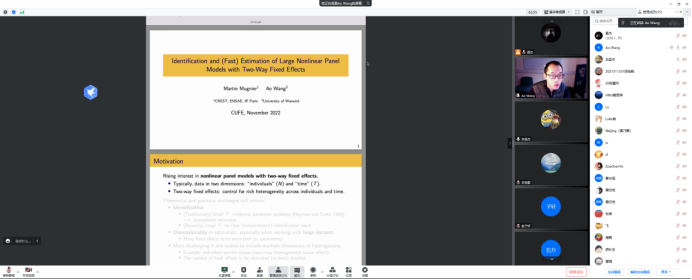 2022年11月24日16:30,华威大学经济学助理教授,华威大学全球经济竞争优势研究中心(CAGE)副研究员王骜(Ao Wang)应新葡萄8883官网AMG官网邀请,进行了主题为“Identification and (Fast) Estimation of Large Nonlinear Panel Models with Two-Way Fixed Effects”的讲座。本次讲座在线上进行。王骜教授受到了新葡萄8883官网AMG官网老师与同学们的热烈欢迎。新葡萄8883官网AMG官网洪圣杰副教授主持讲座,黄乃静副教授参加了讲座。