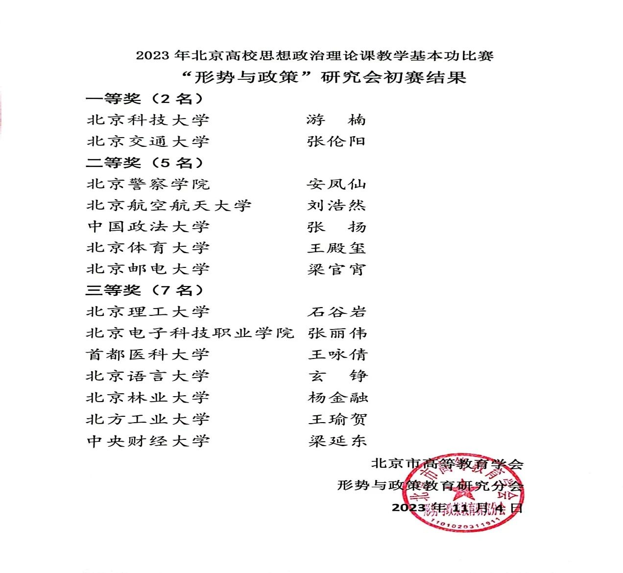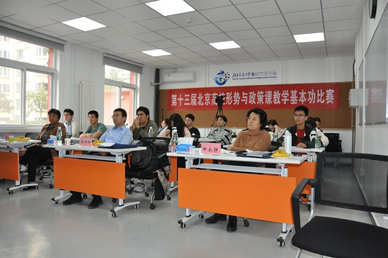 本次比赛由北京市高等教育学会形势与政策教育研究分会主办,北京交通大学马克思主义学院承办。来自北京大学、北京航空航天大学、北京理工大学、北京邮电大学、中国政法大学、新葡萄8883官网AMG官网、对外经济贸易大学、北京科技大学、北京林业大学、北京化工大学、北京交通大学等24所在京高校的“形势与政策”课教师参加了比赛。比赛以推动党的二十大精神融入思政课教学为主题,重点考察思政课教师学深悟透党的二十大精神,并将其融入课堂教学的理论水平,特别是立足京华大地生动实践讲好“大思政课”的能力。