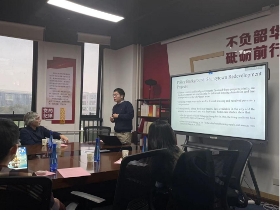 新葡萄8883官网AMG官网吴楠老师做题为“Anti-slum Policy and Workers’Location Choices: Evidence from China”的演讲。吴楠老师首先引入本文的政策背景,分别介绍了中国的反棚户区政策与劳动力迁移状况,强调了对于迁移劳动力而言,便利的生活设施和相对低廉的住房成本非常重要,而由于缺乏城市户口,迁移到城市中的劳动力难以获取廉价的住房,一般居住在“非正规住房”中,因此在2008年前后,“非正规住房”在中国各地的占比都比较高。之后,吴楠老师详细介绍了中国自2008年起的棚户区重建项目,并解释了其作为政策冲击的可行性。随后,吴楠老师展示了本文的交错双重差分模型与数据,并简要介绍了实证结果。他介绍,随着棚户区重建项目展开,总劳动力供给增加,但本地劳动力占比下降,拥有高技能的迁移劳动力比例上升。这说明中国反棚户区政策促进了劳动力的迁移,尤其是高端劳动力的迁移。最后,吴楠老师谈及本文可能的进一步分析,想要构建说明政策对国内移民的影响模式的理论模型,并探索决定棚户区改造政策效果的城市具体特征。