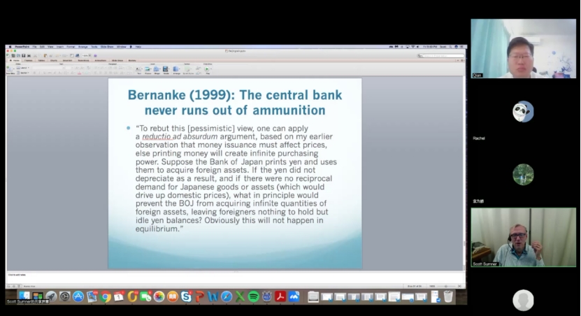 在课程的最后,Sumner教授回答了与会师生的一系列问题。Sumner教授对中国名义GDP指标对货币政策的指导意义,对是否要救助债务风险,汇率问题,财政政策与货币政策的关系,以及资本市场的管制与货币政策的关系等问题回答了听众的提问。