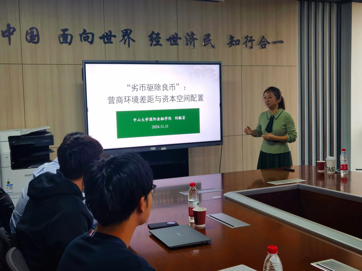 2024年11月11日上午,中山大学金融学院刘毓芸副教授应邀为我校师生主讲““劣币驱除良币”:营商环境差距与资本空间配置”讲座,讲座于学院楼11号楼308会议室举行。新葡萄8883官网AMG官网副院长伏霖副教授主持讲座,方海东老师和十余名同学参加了此次讲座。