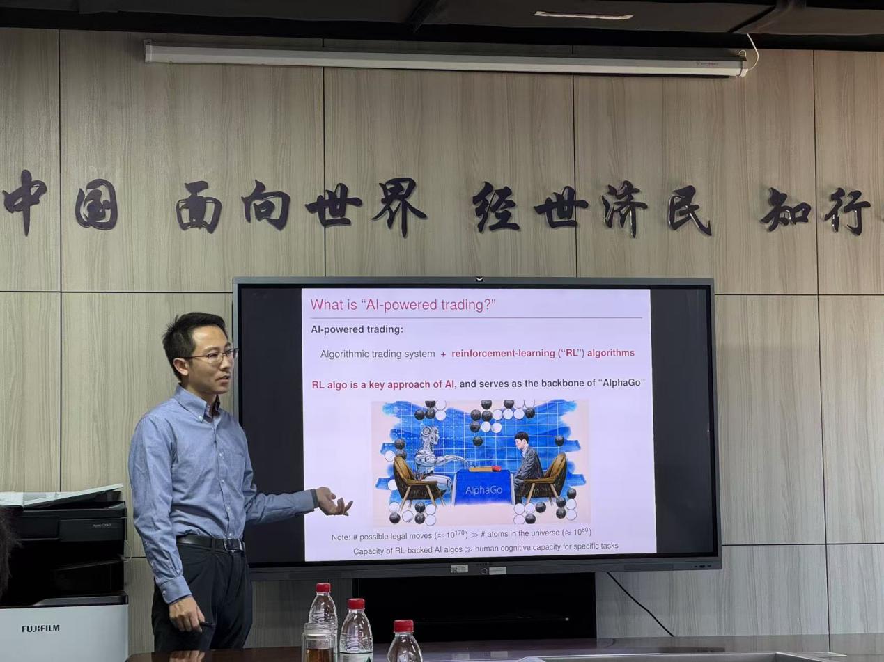 在讲座中,吉岩副教授以人工智能对数字金融的重要性为切入点,利用强化学习算法Q-learning,从理论研究的角度探讨了AI技术如何影响市场力量、信息租金、价格信息性、市场流动性和定价偏误,深入研究了算法交易与强化学习结合的AI驱动交易对资本市场的显著影响。研究结果表明,知情的AI投机者能够自主学习以维持合谋利润,AI合谋通过两种不同的机制出现:一种是在价格效率和噪声交易风险都较低时,通过价格触发策略实现(“artificial intelligence”);另一种是在存在学习中的自我认知偏差时实现(“artificial stupidity”)。吉岩副教授的研究不仅揭示了AI技术在资本市场中的复杂作用,也为理解AI技术在全球贸易和技术竞争中的影响提供了新的视角。