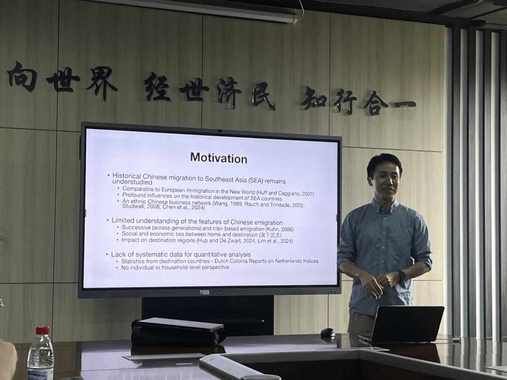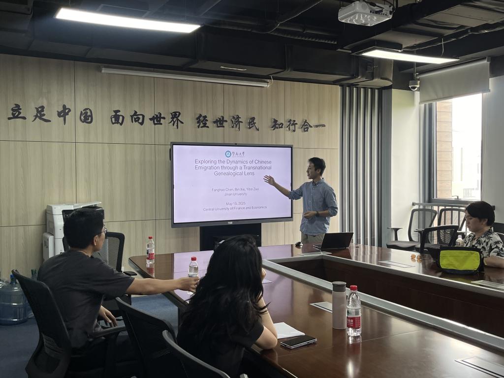 5月16日周五下午,新葡萄8883官网AMG官网“中青年学者讲座”于沙河校区学院楼11号楼308会议室举行。此次讲座邀请到暨南大学新葡萄8883官网AMG官网陈方豪助理教授,分享题为“Exploring the Dynamics of Chinese Emigration through Transnational Genealogical Lens”的研究。新葡萄8883官网AMG官网胡志安副教授主持讲座,新葡萄8883官网AMG官网多位老师和十余名学生参加了此次讲座。