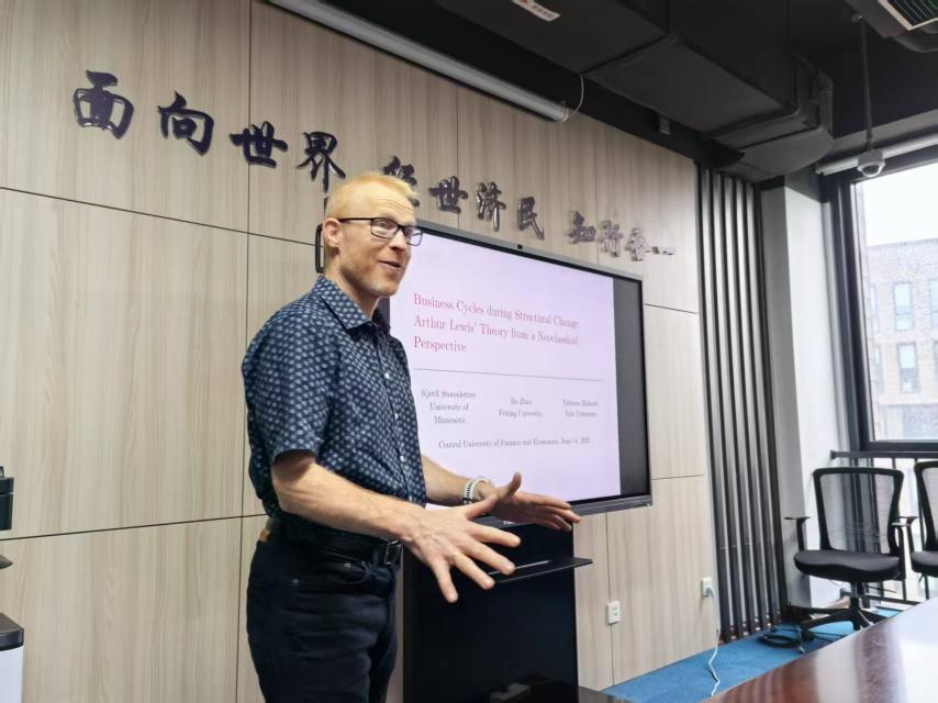 Storesletten教授在由新葡萄8883官网AMG官网顾诗骏老师主持的公开研讨会上,介绍了自己与Fabrizio Zilibotti教授和赵波教授合作的最新研究“Business Cycle during Structural Change: Arthur Lewis’ Theory from a Neoclassical Perspective”。 Storesletten教授发现,基于中国的数据,在农业部门规模庞大但不断萎缩的国家,总就业率与国内生产总值不相关,即使农业劳动生产率上升,农业就业率在经济增长过程中会下降。为了解释上述现象,Storesletten教授的论文提出了一个统一的商业周期和结构变化理论,该理论强调在资本积累的推动下,农业的衰退和现代化同时发生:随着农业的资本密集型程度越来越高,传统的农业生产方式被挤出市场。根据量化分析结果,该模型能够解释中国的结构转型和商业周期波动。