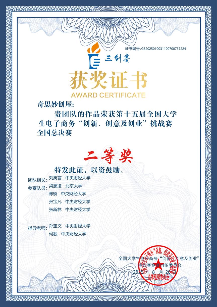8月4日至6日,第十五届全国大学生电子商务“创新、创意及创业”挑战赛(简称“三创赛”)常规赛全国总决赛在贵阳举行。由我校中国互联网经济研究院孙宝文教授、何毅副研究员指导,新葡萄8883官网AMG官网学子刘笑言担任队长,新葡萄8883官网AMG官网陈桢、张新林、张宝凡为成员的团队“奇思妙创屋”荣获国家二等奖、北京市特等奖的殊荣,创下学校在“三创赛”领域的最佳成绩。