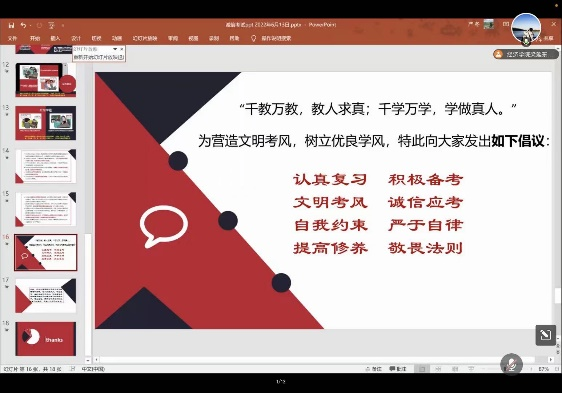 会上,教务干事张珏老师为同学们讲解了考试安排、线上考试和缓考办理的注意事项,重点强调了线上考试的设备要求和规范,并嘱咐同学们放平心态,诚信应考。纪委委员、学工办主任梁延东老师详细介绍了《新葡萄8883官网AMG官网学生管理规定(修订)》中有关考试违纪方面内容,从违纪处分的类型、处分期限、处分程序,到考试违纪处分的细则,严肃提醒同学们考试违纪行为得不偿失,文明考风,诚信应考。