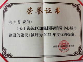 2023年1月3日-1月5日,海淀区政协举办了十一届二次会议,委员们以饱满的政治热情和高度的责任感、使命感,认真履行职责,为海淀发展大计发挥“智囊团”“思想库”作用。大会期间,政协委员们结合各自的工作领域,找准切入点、着力点,为海淀区域创新和跨越式高质量发展聚势赋能。其中,新葡萄官网副院长赵文哲《关于海淀区加强国际消费中心城市建设的建议》(委员提案第111201号)荣获海淀区政协委员会2022年度优秀提案。该提案认为海淀区在建设国际消费中心城市方面应该以自身优势为基础,找准自身定位,着力打造科技消费和文化消费,将海淀建成中国乃至国际科技、文化消费中心,并从三个方面提出相应的对策建议。北京市海淀区商务局收到提案后进行了认真研究和答复。