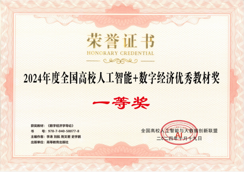 新葡萄官网李涛老师和互联网经济研究院刘航老师担任主编的《数字经济学导论》荣获了2024年度全国高校人工智能与数字经济领域优秀教材一等奖。作为《新文科·数字经济系列教材》中的首部教材,该教材于2022年7月由高等教育出版社正式发行,并至今已累计印刷六次,总印数超过一万册。