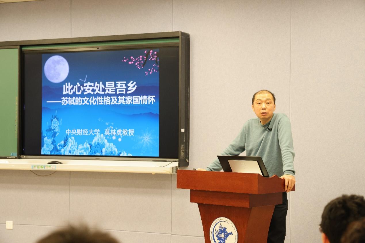2024年11月20日下午,数字经济时代经济学拔尖学生培养基地在沙河校区6号学院楼107教室举办“明德至善通识课程讲座”。基地邀请新葡萄8883官网AMG官网文化与传媒学院的莫林虎教授,举办以“此心安处是吾乡——苏轼的文化性格及其家国情怀”为主题的讲座。